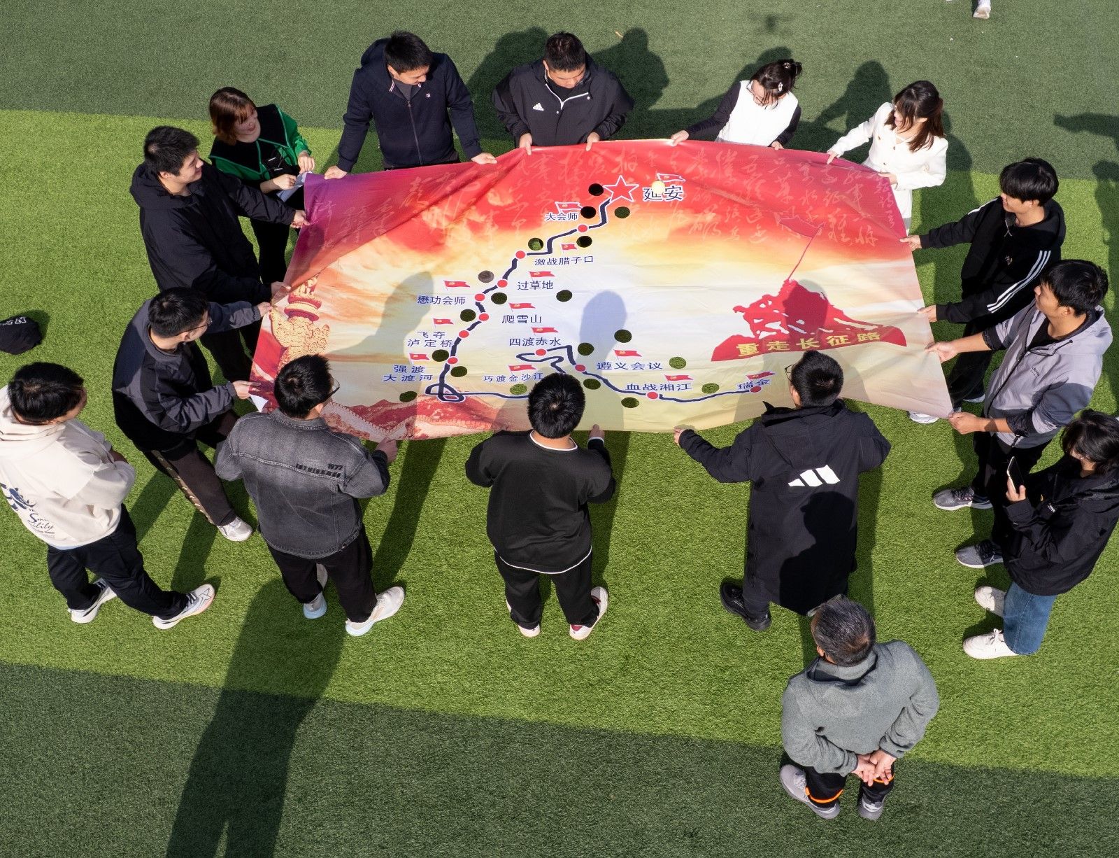 活动以“组团队、起队名、定口号”的“破冰三部曲”开篇。“重走长征路”环节中,党员通过操控画布推动网球沿长征路线前行;“同心击鼓”让党员在同步协作中体会团结力量;“正义套圈”以趣味互动传递“廉”“正”“清”等理念。高潮环节“共绘巨图”中,党员们共同执笔,将分散图块绘成廉洁主题壮丽画卷。